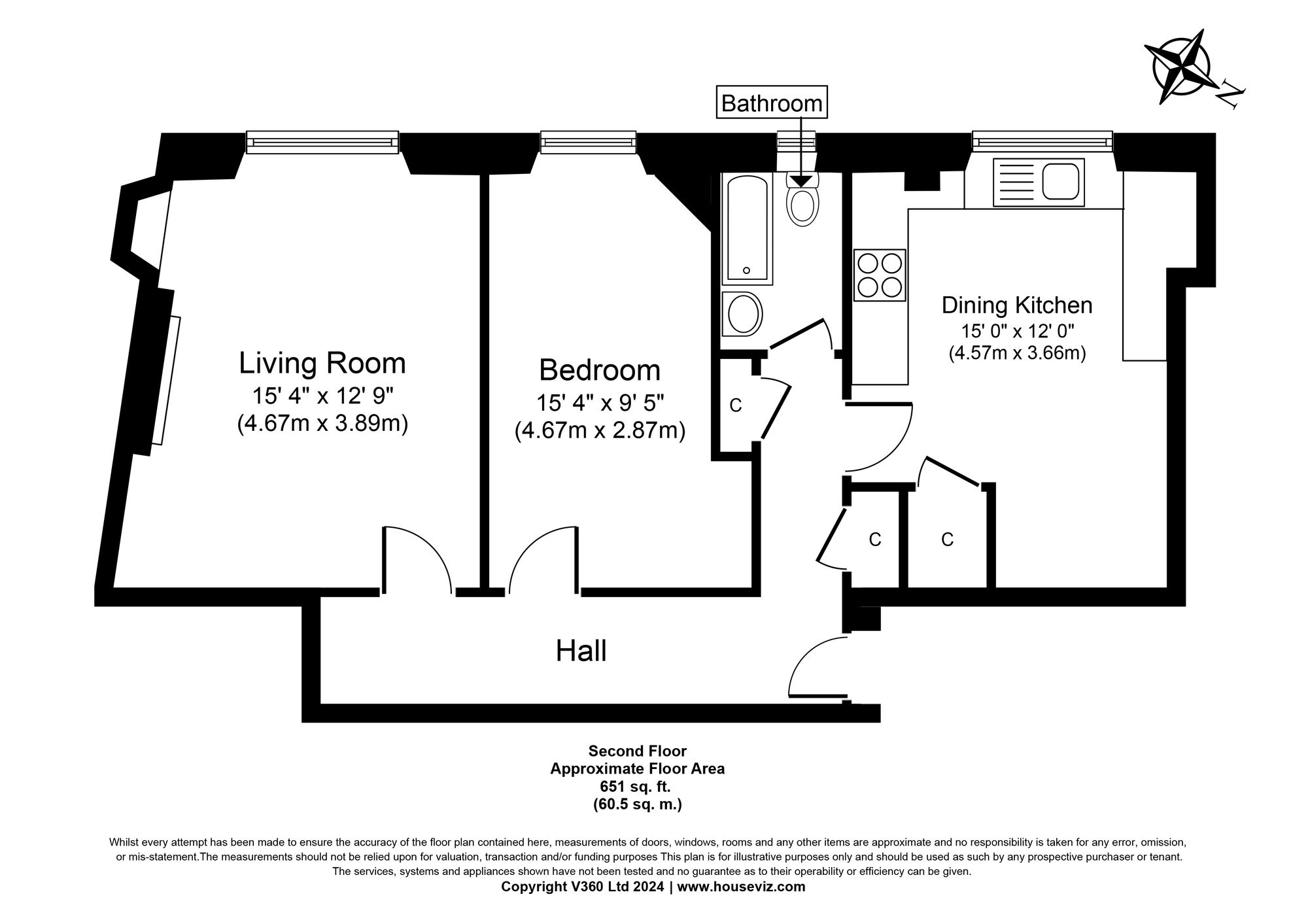 The generously proportioned double bedroom is carpeted, creating a cosy feel, while the tiled bathroom is fitted with a shower over the bath. Engineered oak wood flooring runs through the hallway and living room, complementing the property's original doors and period features.