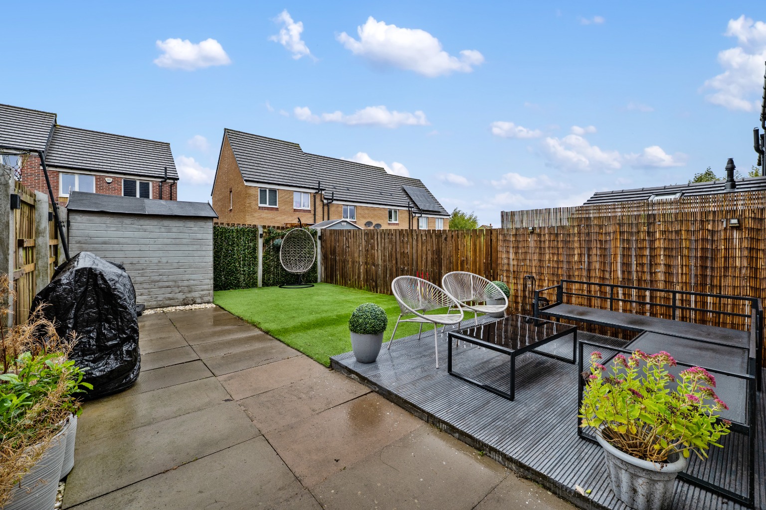 The property benefits from an enclosed rear garden with both lawn and patio areas, designed for outdoor dining and relaxation. To the front, a private driveway provides off street parking.