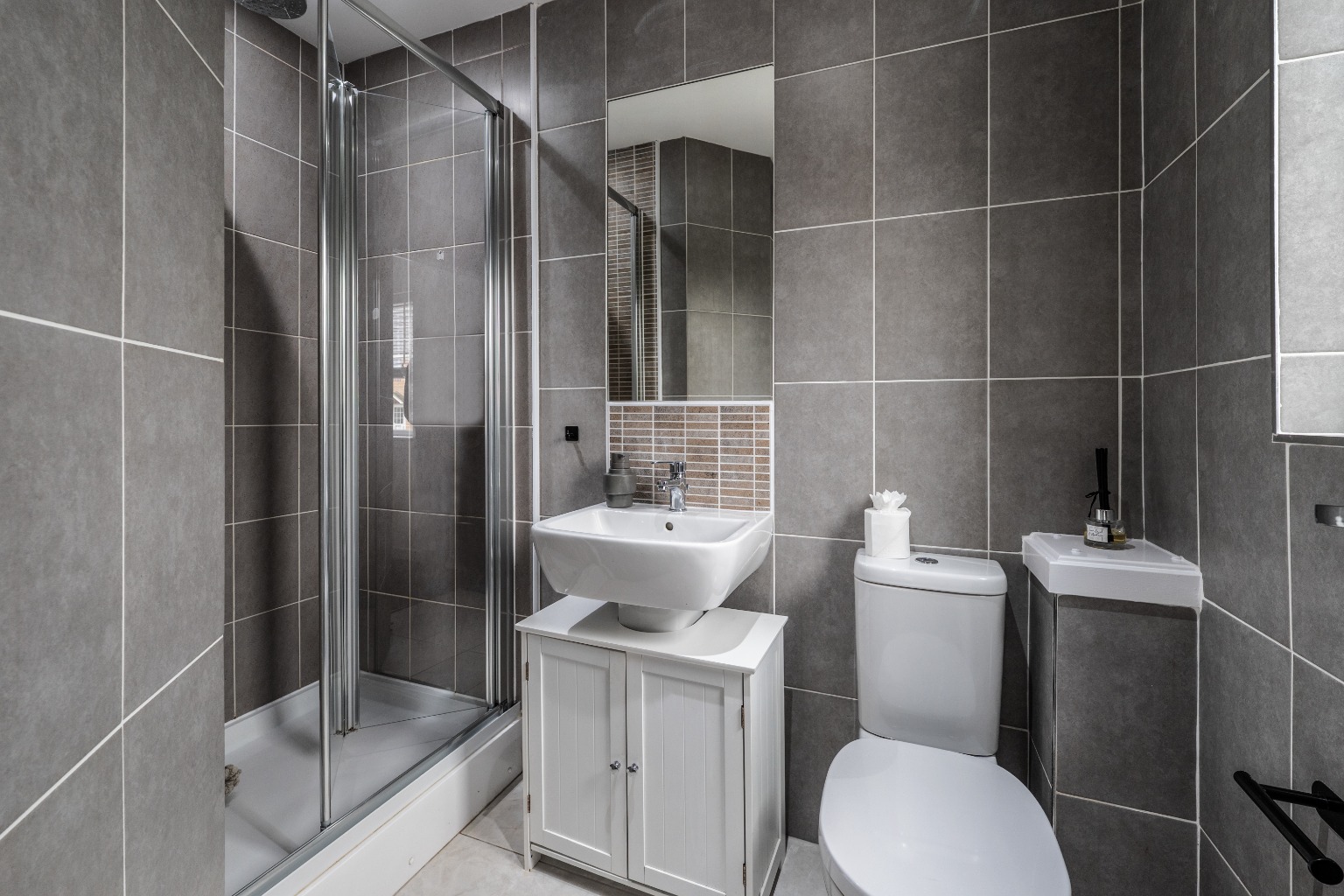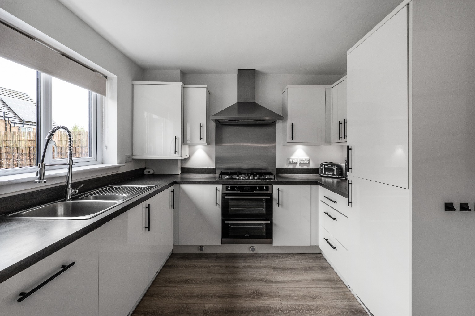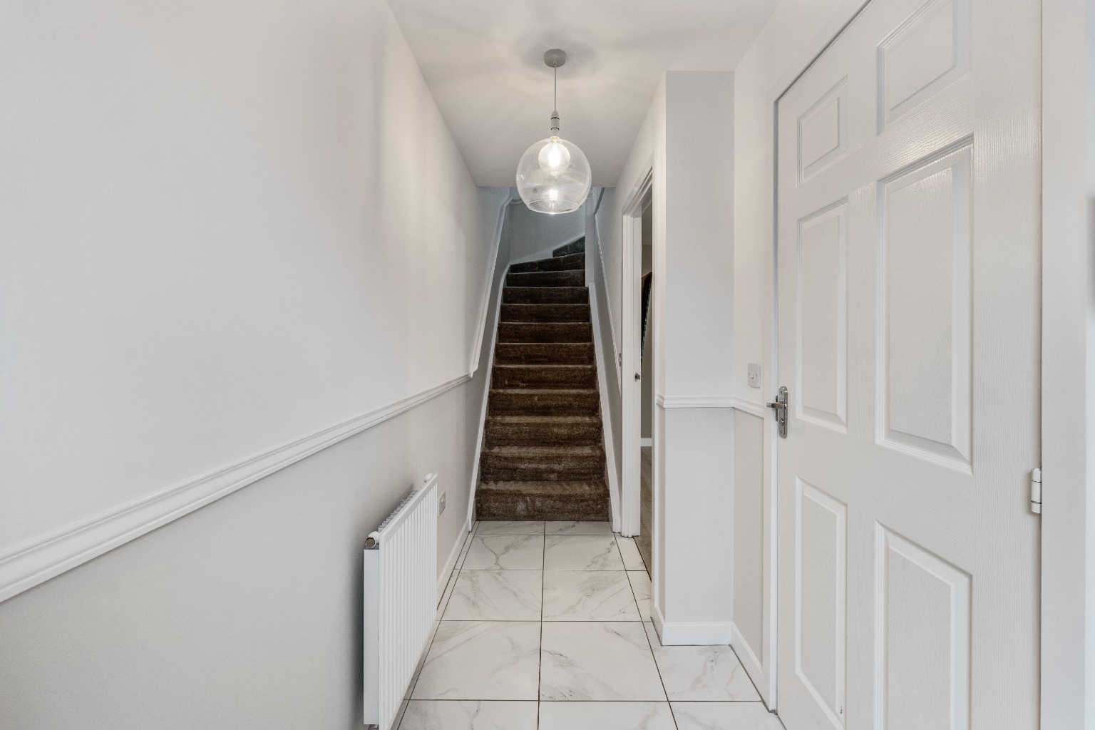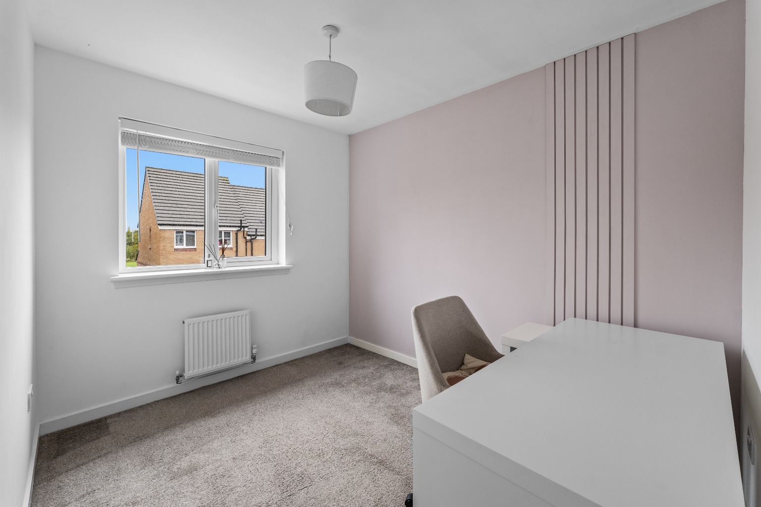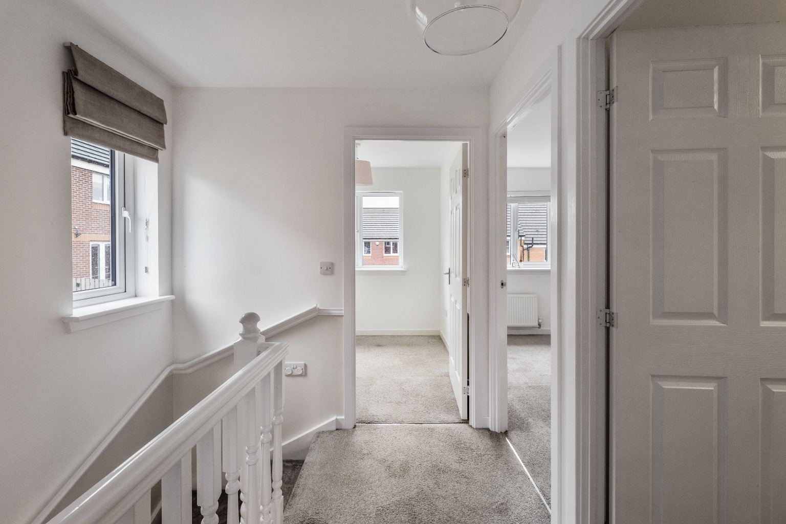 A bright lounge sits to the front, finished in neutral tones and filled with natural light. Upstairs, the principal bedroom includes fitted wardrobes and an ensuite shower room. There are two further well proportioned bedrooms which provide flexibility for family, guests or home working. A modern family bathroom with three piece suite completes the upper level.