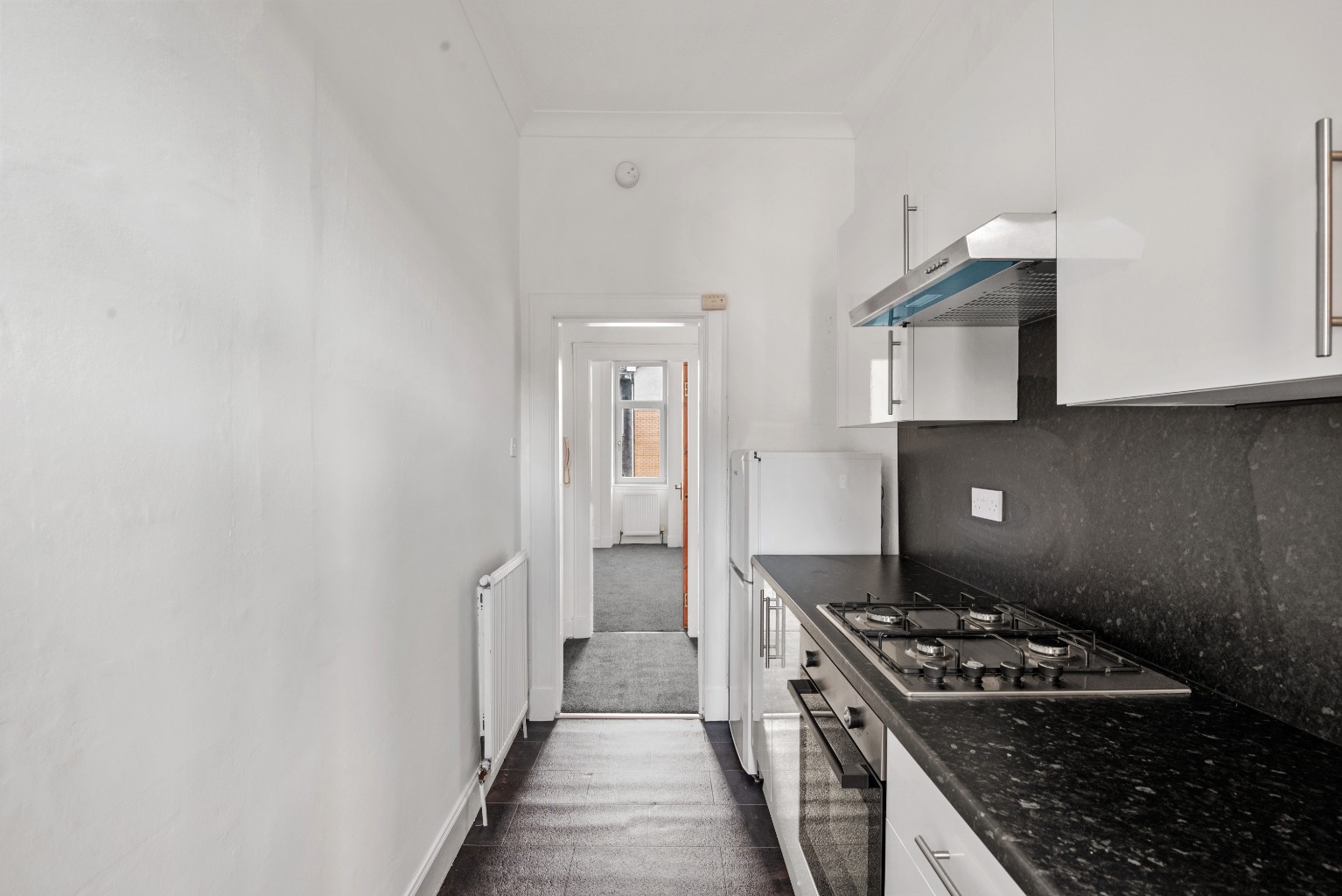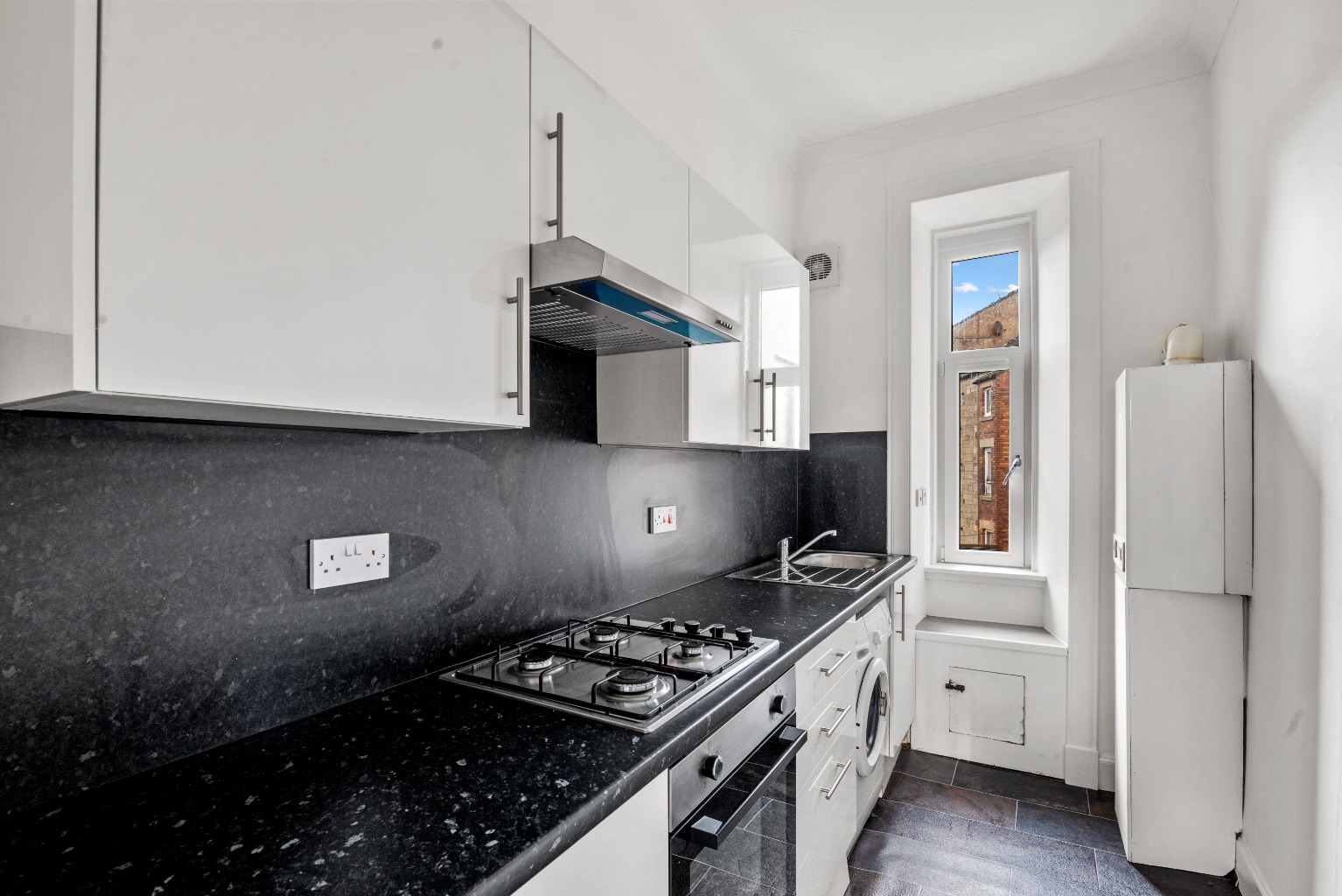 The kitchen is practical and well-fitted with a range of base and wall-mounted units, worktops, and an integrated oven and gas hob. There’s also space for freestanding appliances.